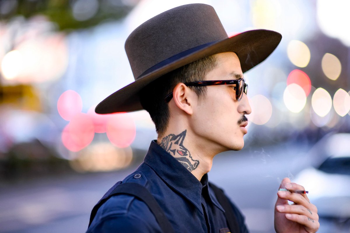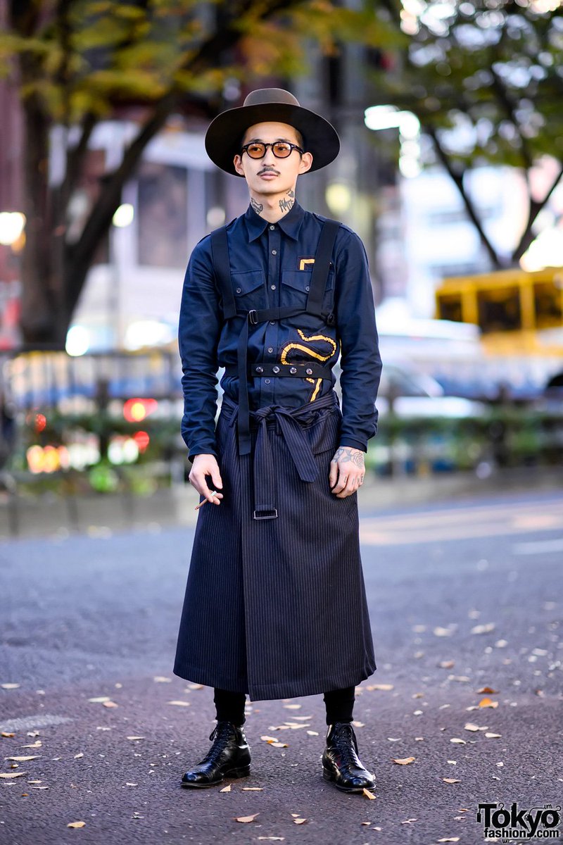 25-year-old Japanese designer/artist Ryoughty on the street in Harajuku wearing a retro look with a shirt and skirt by Dries Van Noten, vintage dress shoes, and a wide brim hat by The Fat Hatter