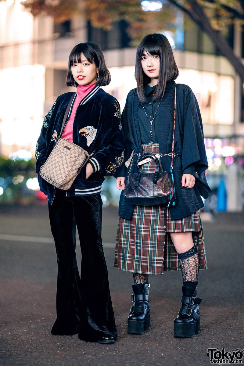18-year-old Japanese students Chinatsu and Shiiio on the street in Harajuku wearing a sukajan and vintage kimono along with items from Romantic Standard, Vivienne Westwood, Gucci, Faith Tokyo, and Bubbles Harajuku