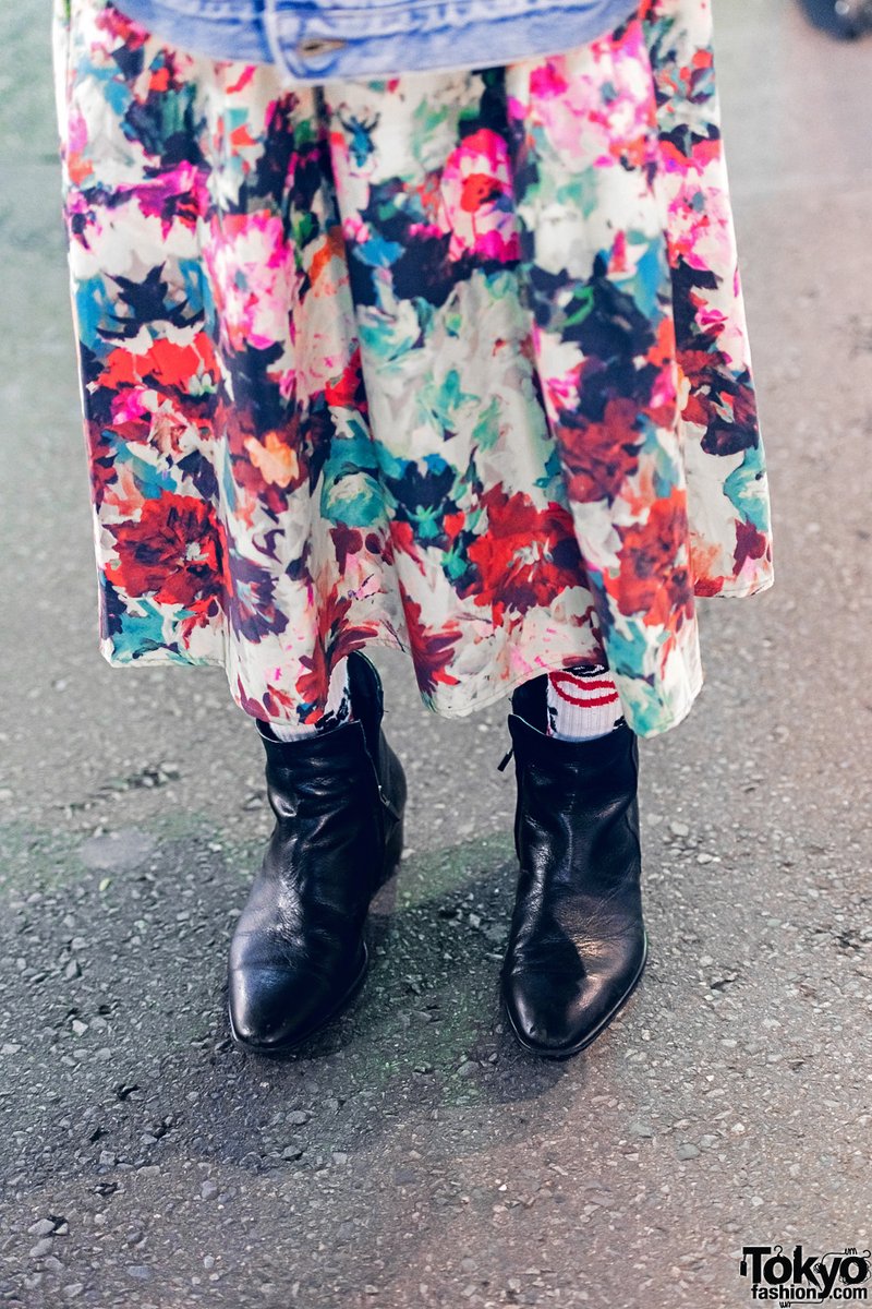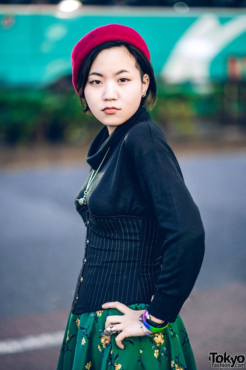 Japanese college student Satoho on the street in Harajuku wearing a corset over a vintage sweater, floral maxi skirt, Reebok sneakers, and Vivienne Westwood accessories