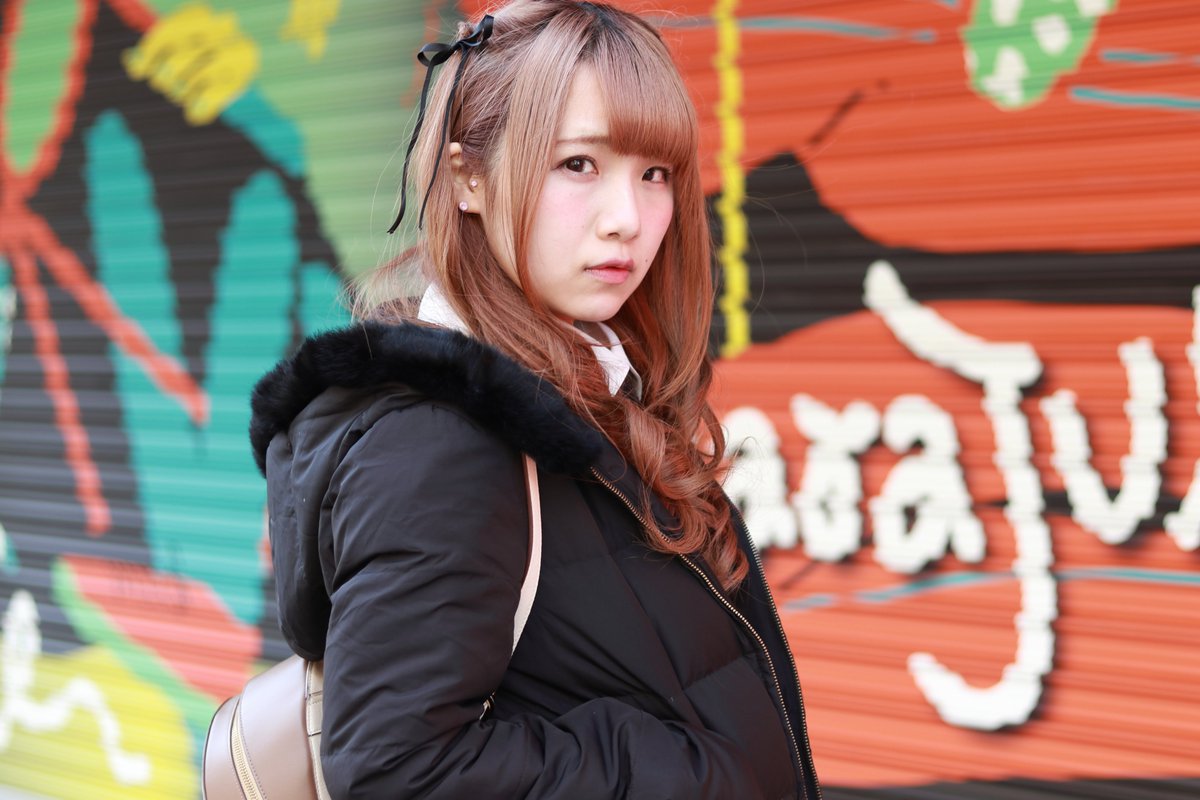 17-year-old Japanese student Billimayu on the street in Harajuku wearing a long vintage coat over a UNIQLO cropped turtleneck, John Lawrence Sullivan pants, a Vivienne Westwood handbag, and vintage/resale accessories