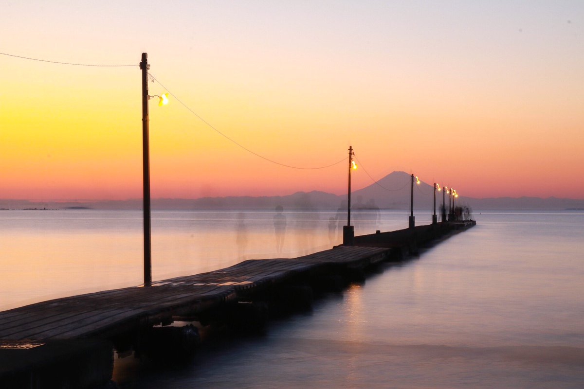千葉県南房総市 原岡海岸の桟橋 桟橋と富士山の夕景 夕刻になると、桟橋に電球の照明が付き、幻想的な場所になります。 夜は怪しい感じで、桟橋を歩いていくと、 違う世界に行ってしまうのではないか! という感覚になれます。