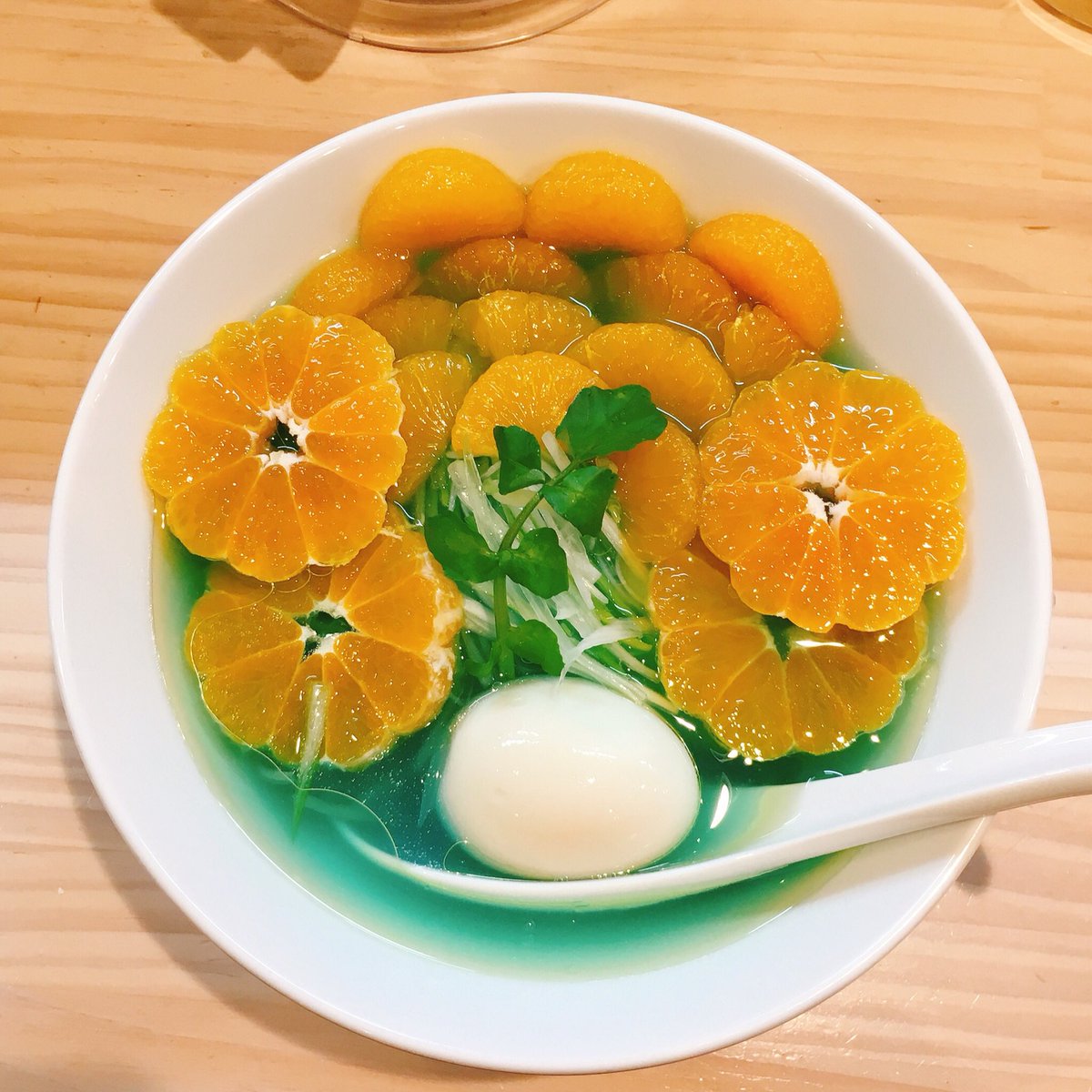新年初 #吉法師 さん 看板の青ラーメンにミカンが乗りさらにミカンをマシたモノスゲイやつ! ブルーリキュールの香りと酸味があいまり芳醇かつ爽やかな仕上がりになる吉法師マジック今年も健在♡ ごちそうさまでし鯛(ΦωΦ)