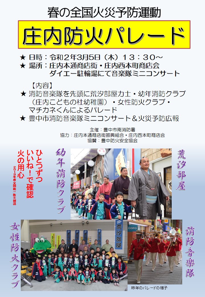 「庄内防火パレード」 消防音楽隊を先頭に「荒汐部屋」の力士&幼年消防クラブ&女性防火クラブ&マチカネくんも参加 (雨天決行) 音楽隊のミニコンサートでは幼年消防クラブも歌って踊りも披露