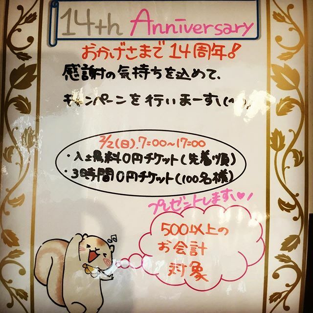 この度、2/2(日)に 14周年を迎えます!! 皆様ありがとうございます(❁ᴗ͈ˬᴗ͈) 入場料無料と3時間無料の チケットを配布☆*。 2/2(日)当日、 500円以上のお会計の方を対象に、 先着順になっております! 7時~17時受付!! お待ちしてます(♡)