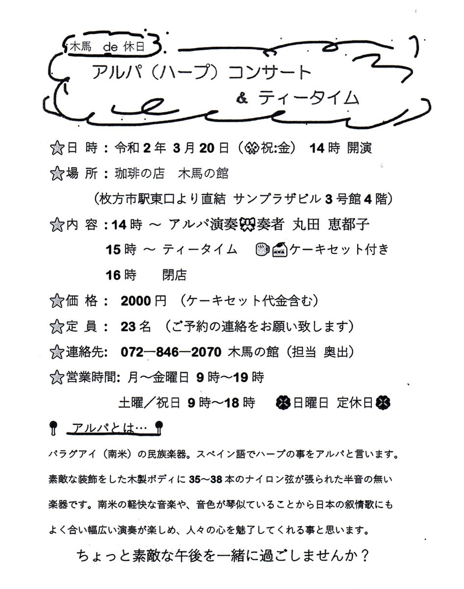 喫茶「木馬の館」のミニコンサート。 枚方市駅に隣接するビル、サンプラザの4階にお店があります。