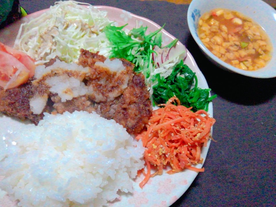 今日の夕食は牛肉カツ大根おろしがけ、ほうれん草のおひたし、人参しりしり、アマノフーズさんのフリーズドライトムヤムクンです。