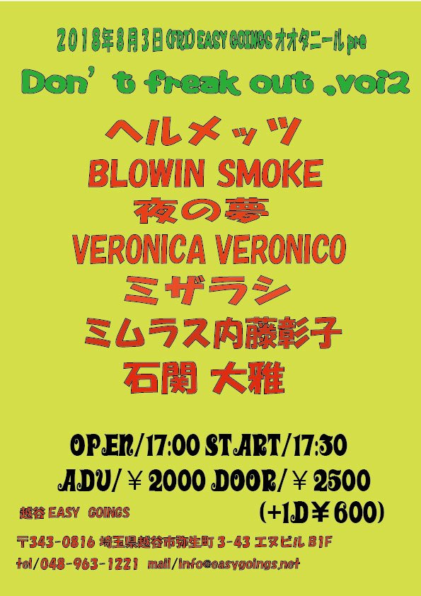 明日は越谷イージーゴーイングスでヘルメッツライブします!! ヘルメッツはトリで9時半くらいからです!! 面子も素晴らしいので是非遊びに来てください