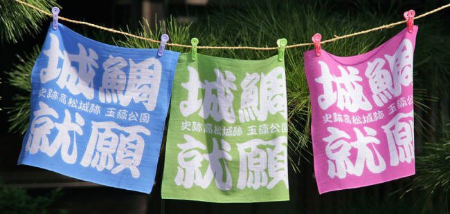 受験生に密かな人気。高松松平藩秘蔵織「保多織(ぼたおり)」500円。玉藻公園でお買い求めください。