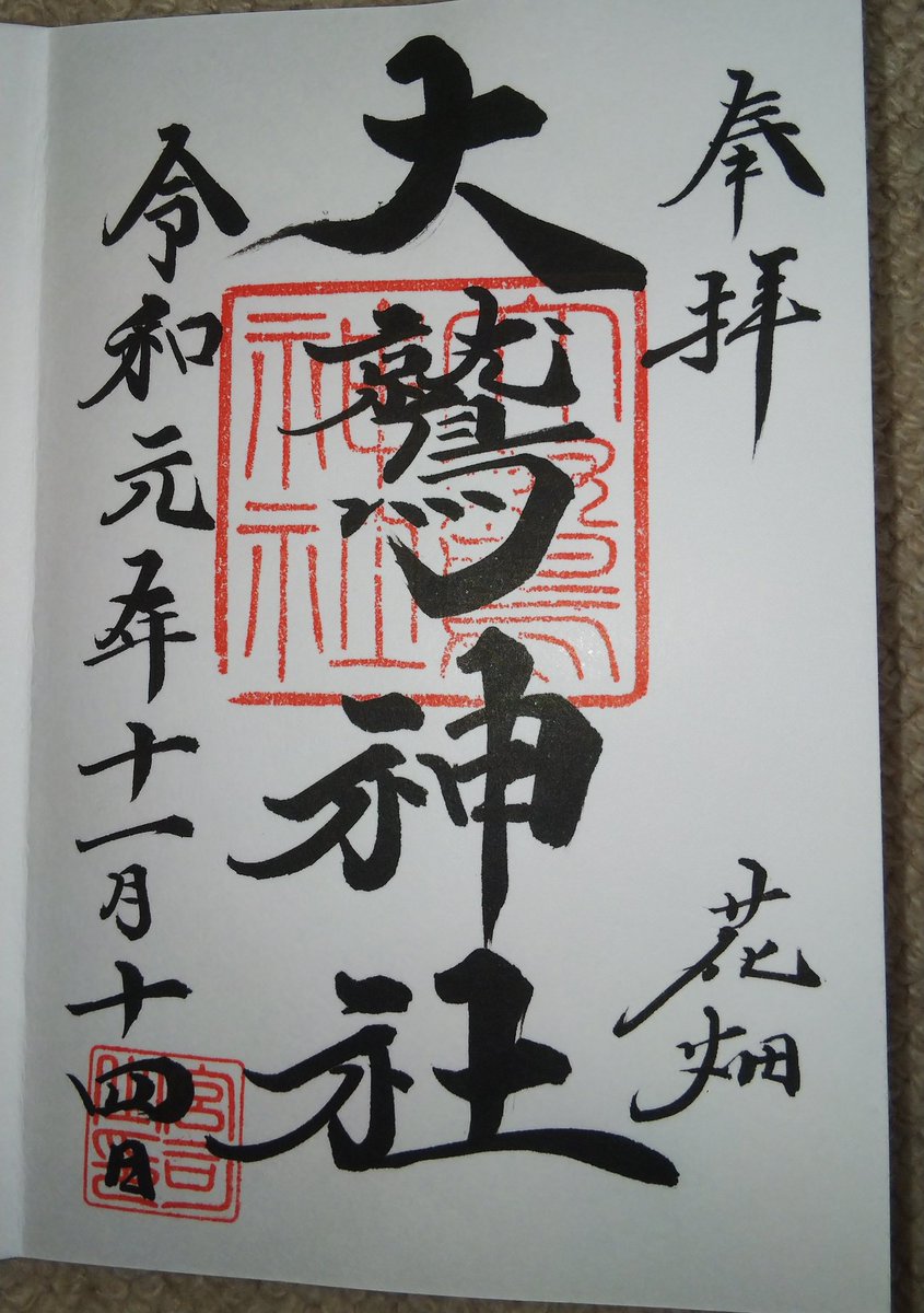 【大鷲神社】 こちらも、先週参拝させていただきました。 昨年の酉の市以来の参拝です。天乃日鷲命、大巳貴命、小名彦命、日本武尊が祀られています。 社宝である金色の鷲の印が押されます。