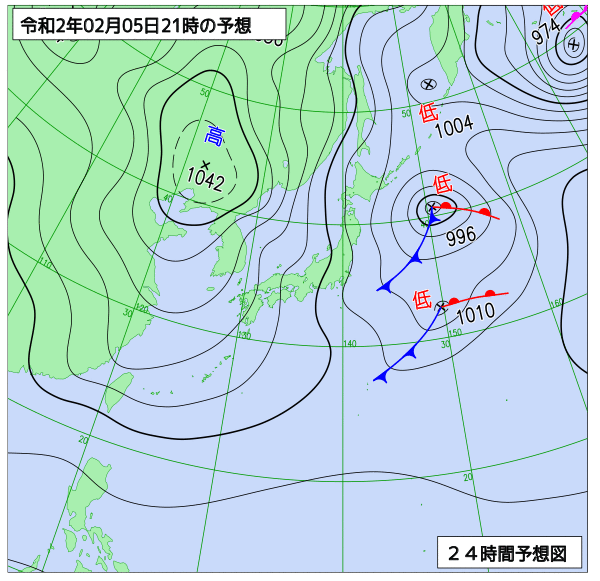 2020-02-04 18UTCの類似天気図を 100例抽出しました。例に挙げた 2002-12-12 日中の東京の天気は晴でした。