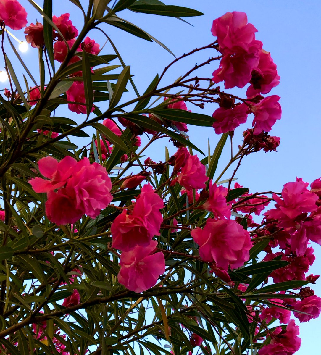 夕暮れ時の空と夾竹桃(キョウチクトウ)の花。エレガントで鮮やな花が風に揺れていました。