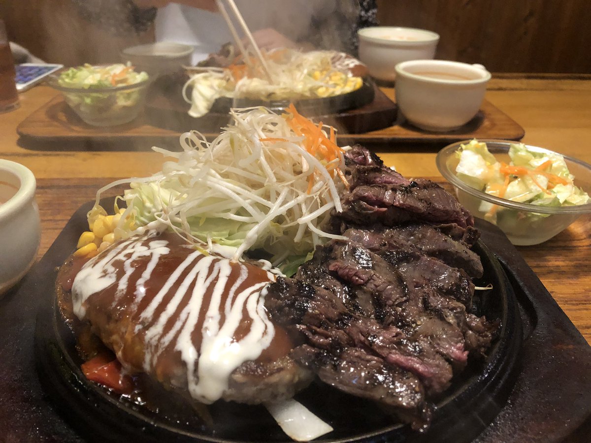 1月の思い出。 食に貪欲になりすぎた。 ステーキのトッピングに、 チーズでもなく大根おろしでもなく目玉焼きでもなく、ハンバーグを選択してしまったよ。 小さなハンバーグかと思いきやゲンコツ