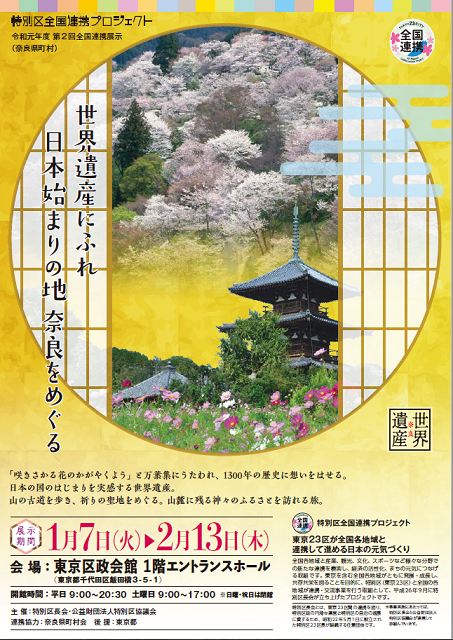 2/13まで(日祝休)、飯田橋の東京区政会館で「世界遺産にふれ 日本始まりの地 奈良をめぐる」展示会開催中!寺社仏閣、グルメなどの魅力をはじめ、悠久の歴史を感じることができる奈良県町村のすばらしさを紹介します。