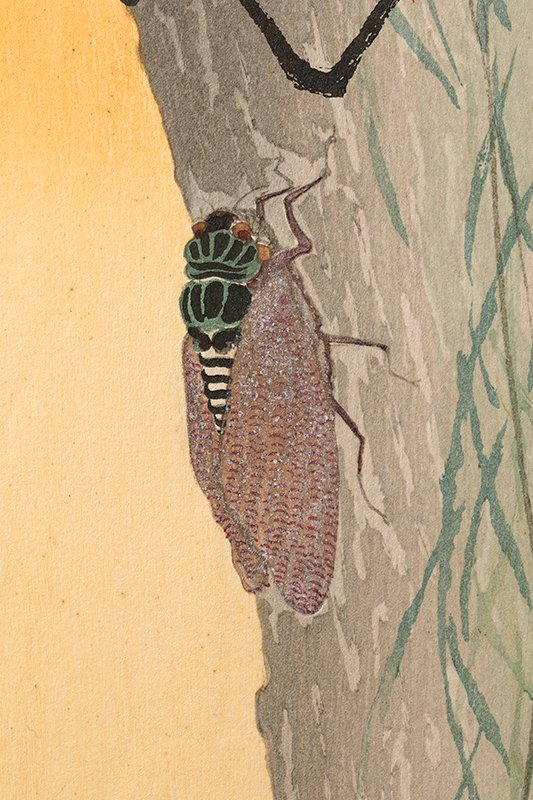 【雲母摺(きらずり)】 雲母の粉(代用品として貝殻の粉を使う場合もあり)を膠や糊で紙に定着させる技法。現在展示している「柳に油蝉」でその技法が用いられ、光に反射すると羽の部分がキラキラ光ってみえます。※ライトの使用はご遠慮ください