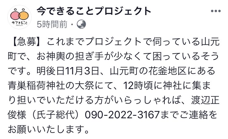 宮城県山元町 青巣稲荷神社 、明後日11/3 の大祭のお神輿担ぎ手募集!!https://www.facebook.com/234072906715110/posts/2379469965508716?sfns=mo … 写真は6年前の植樹祭。真ん中に映る御神木は台風により折れてしまったらしいです(T ^ T)