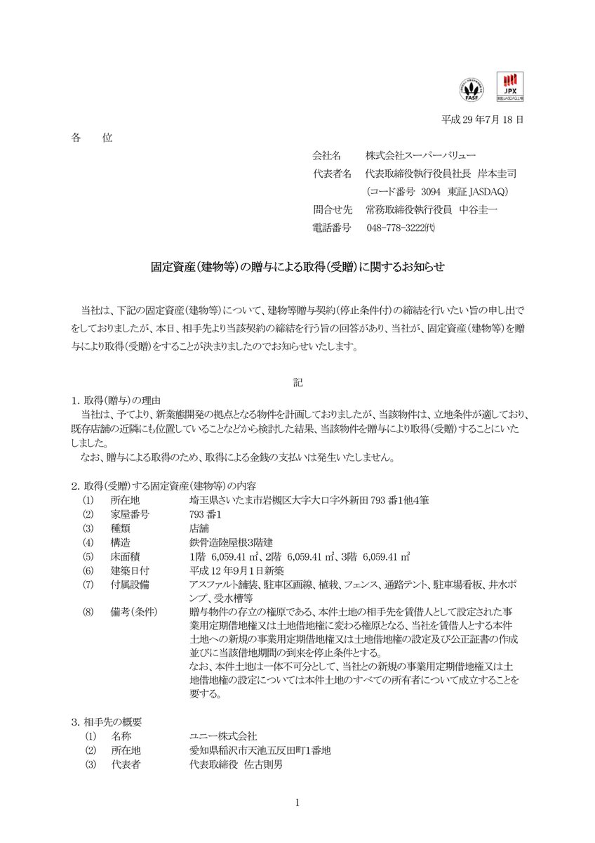 #アピタ#岩槻店 の建物等を「株式会社スーパーバリュー」が贈与を受けるというニュースリリースが出ました。 近日に大型の「スーパーバリュー岩槻店」が開店するのでしょうか? 固定資産(建物等)の贈与による取得(受贈)に関するお知らせ http://www.supervalue.jp/uploads/important-pdf/20170718_1931942793.pdf …pic.twitter.com/xmky03159u