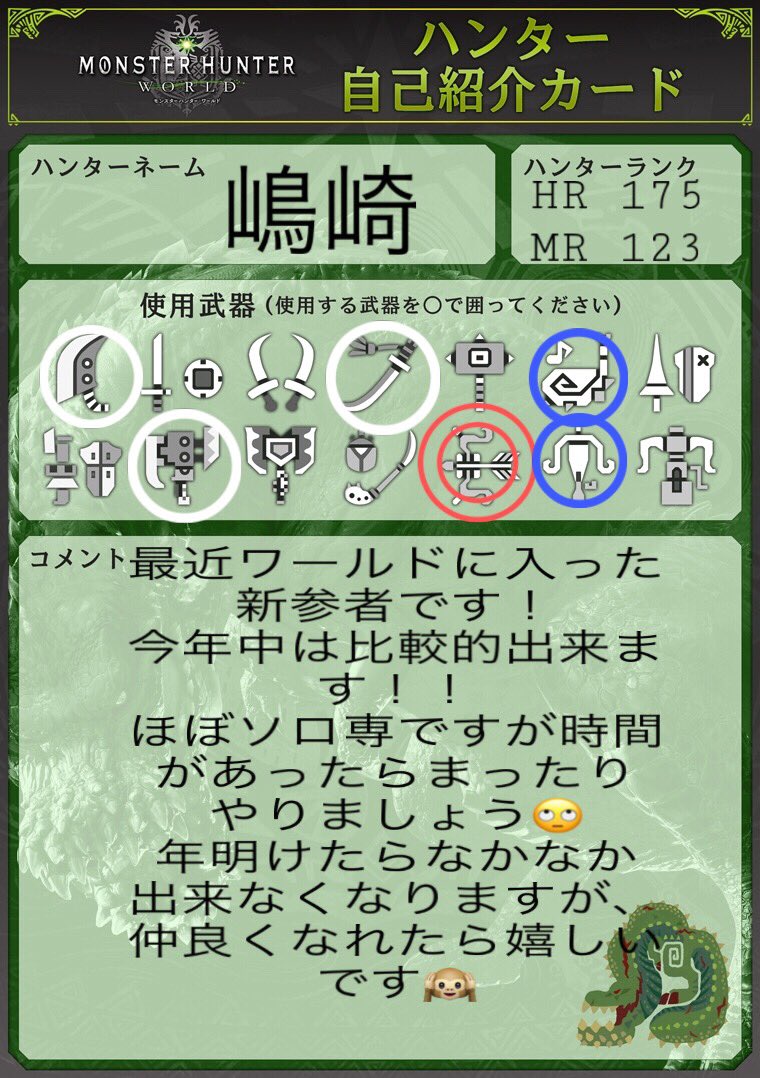 #モンハン自己紹介カード#MHWIB#MHWI#モンハン募集#弓#太刀#スラアク#大剣pic.twitter.com/QxSUzOJRdQ
