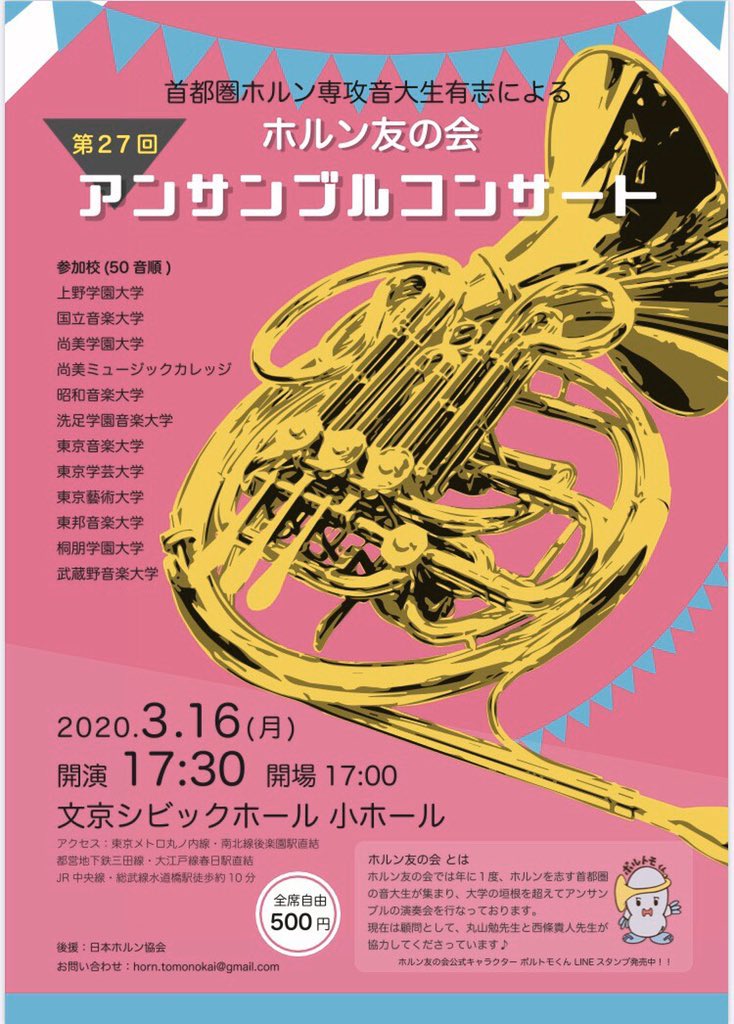 3月16日(月) 首都圏ホルン専攻音大生有志による 第27回 ホルン友の会 アンサンブルコンサート