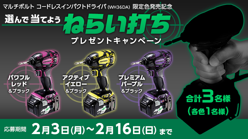 この投稿を引用リツイートして『打ちたいインパクトドライバの色』と『 #ハイコーキねらい打ちCP 』を入力して投稿 で完了 当選者にはDMでご連絡#懸賞#プレゼントpic.twitter.com/Wuradd7rqA