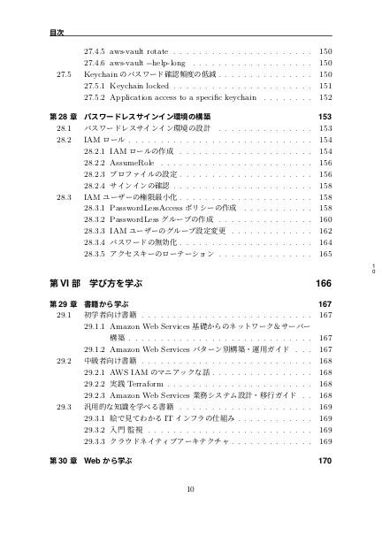 クラウド破産本の目次チラ見せコーナー最終日。第V部の最後ではAWS Vaultを使い、アクセスキーのみでAWSマネジメントコンソールとAWS CLIを両方扱えるようにします。そして第VI部ではいかにしてAWSを学ぶか、というメタな題材を扱います。