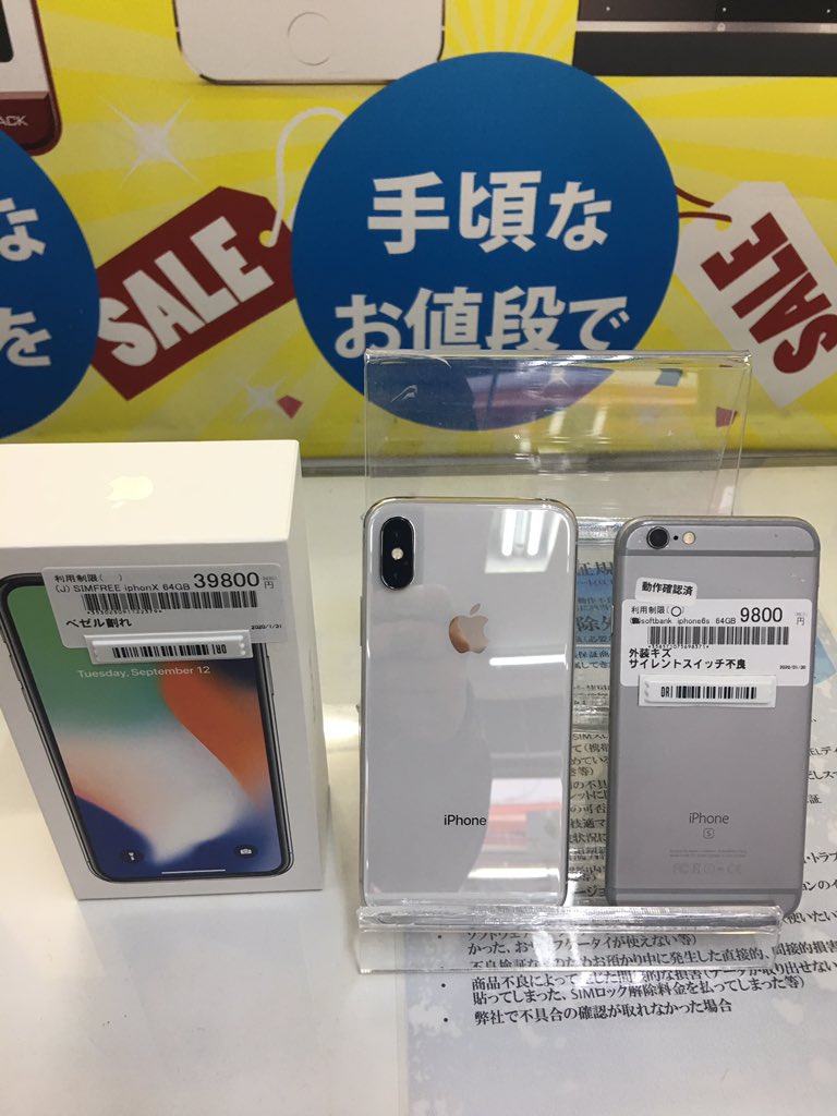 入荷情報です~(*'ω'ノノ゙ SIMフリー iPhoneX 64GB 画面欠け 39800円+税 SoftBank iPhone6s 64GB 利用制限〇 税込9800円 iPhone6sは本日までのセール10%オフ対象となってますのでお早めにどうぞ!