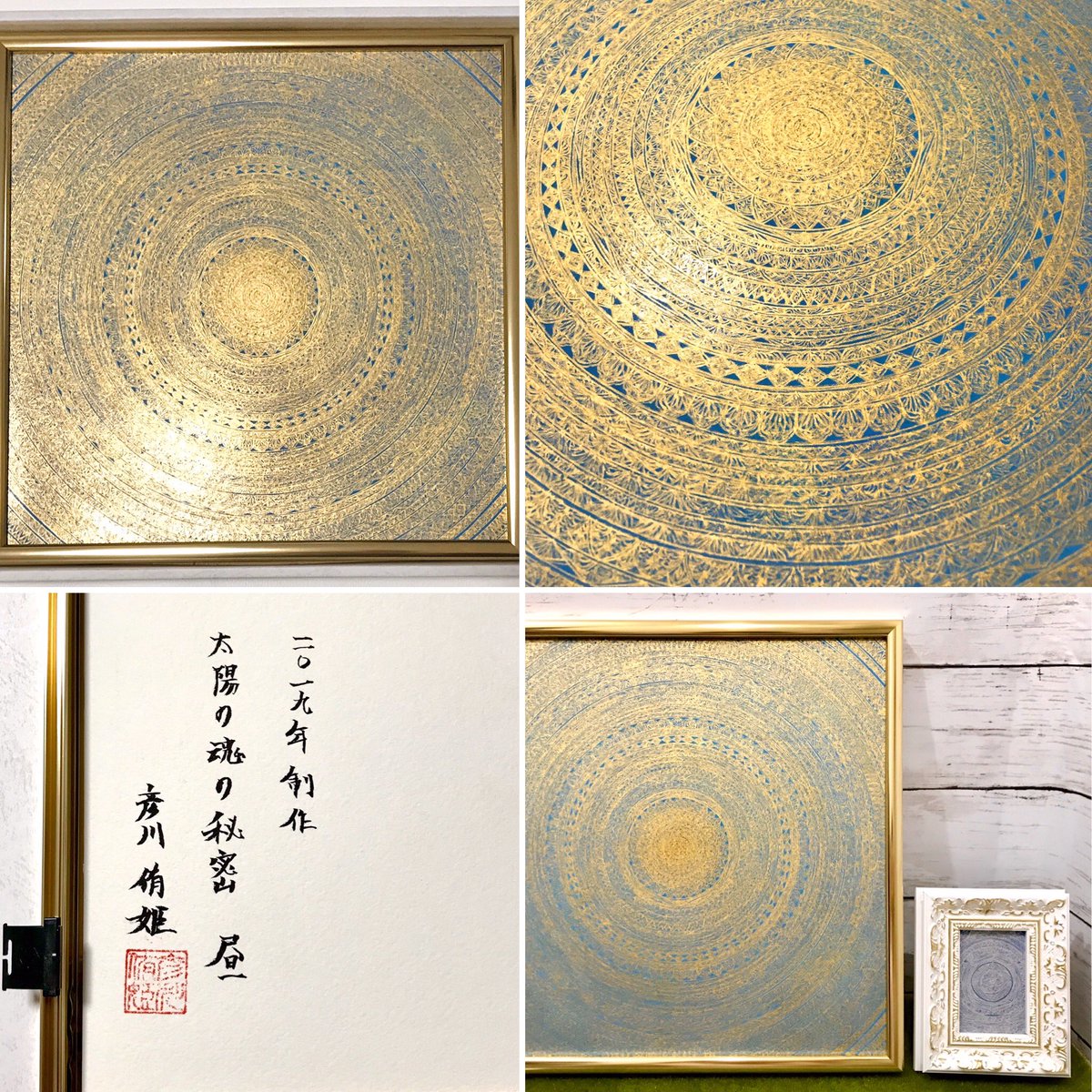 斜めから見ると磨いた純金泥がピカピカと輝いて、裏面には制作年とタイトルと署名と落款があって、他の小作品と比べるとこんなかんじの大きさです。