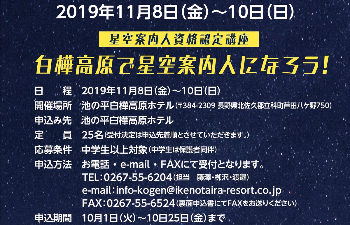 池の平ホテルの姉妹館 白樺高原ホテルで 星空案内人の資格取得講座が 開催されるポタ( ^ω^ )