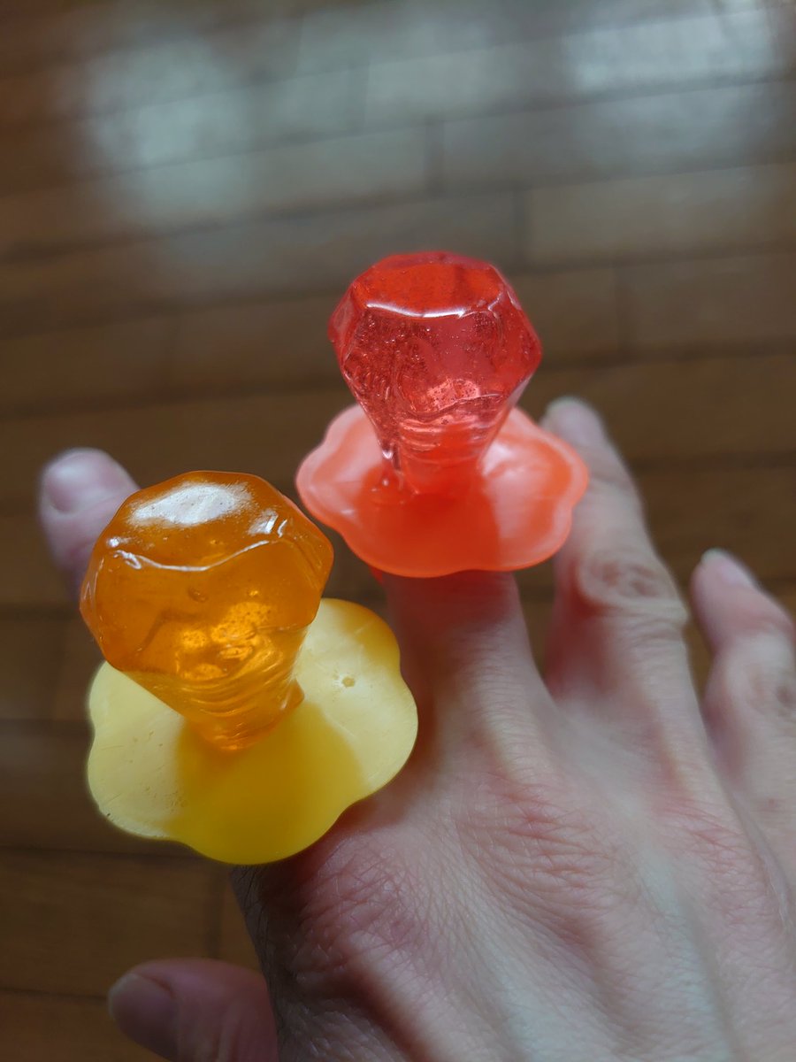 私の知ってるジュエルリングと違う…なんかもっとこう…大きくて(子供の手にはそう見えた?)形ももっと綺麗だったと思う。昔はメロンとコーラしか無かったけど今はオレンジとイチゴあるみたい。しかしイチゴの色じゃないやろ(2枚目、右の飴)