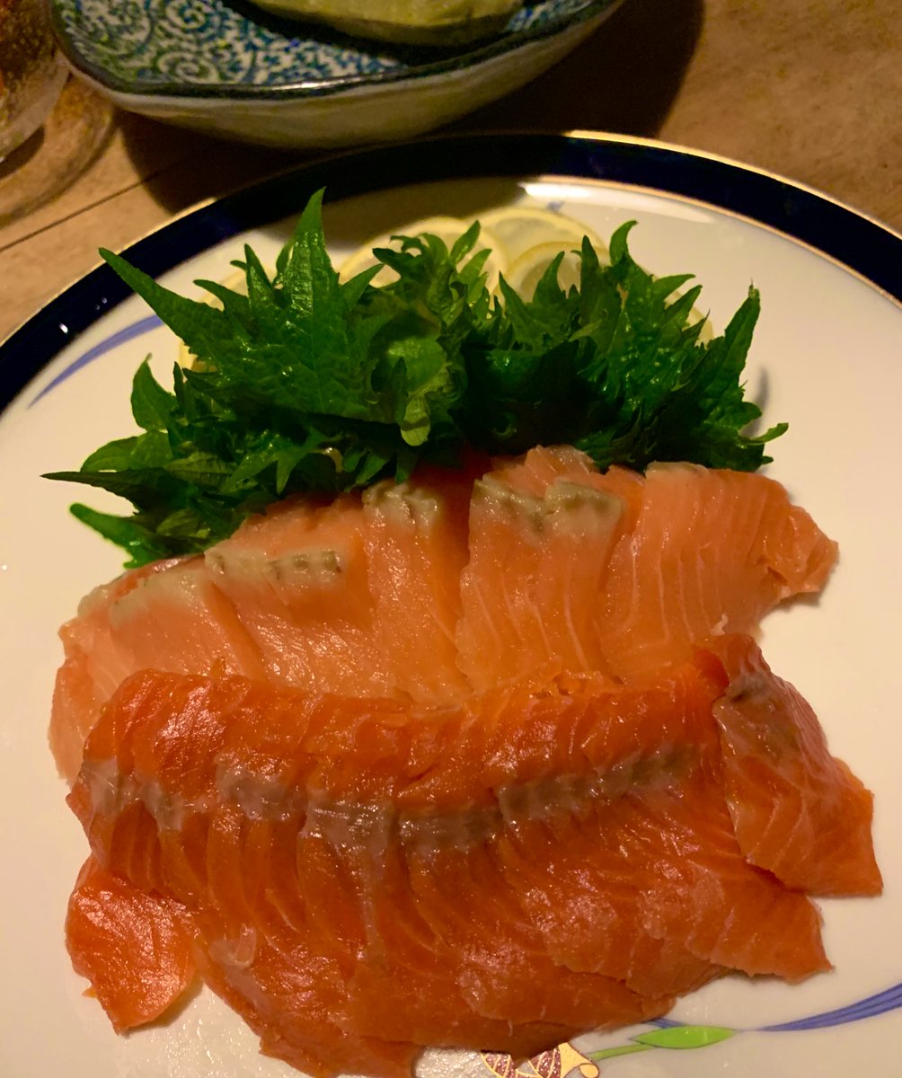 #晩御飯 牛もも肉塊を醤油麹漬けは玉葱人参牛蒡とオーブン焼き 今夜はローストビーフ サーモン刺身は強めの塩で一晩 柚子味噌蒟蒻 フリーズドライのかきたま汁 貰い物だが便利