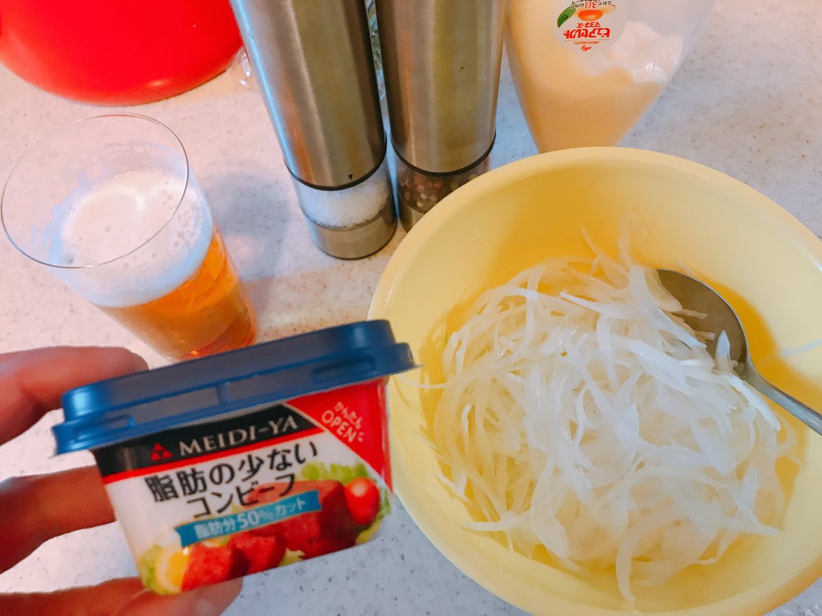 水にさらした玉ねぎとコンビーフにマヨネーズ塩胡椒はうちの定番