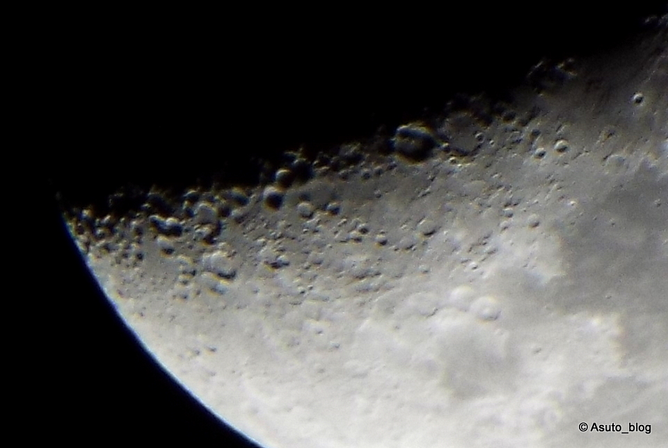 うわっ、Canon SX70HS で超望遠撮影してみたら、本当に月面に X の文字が浮かび上がっていた!!(明暗境界左から 1/4 ぐらいの場所に注目)