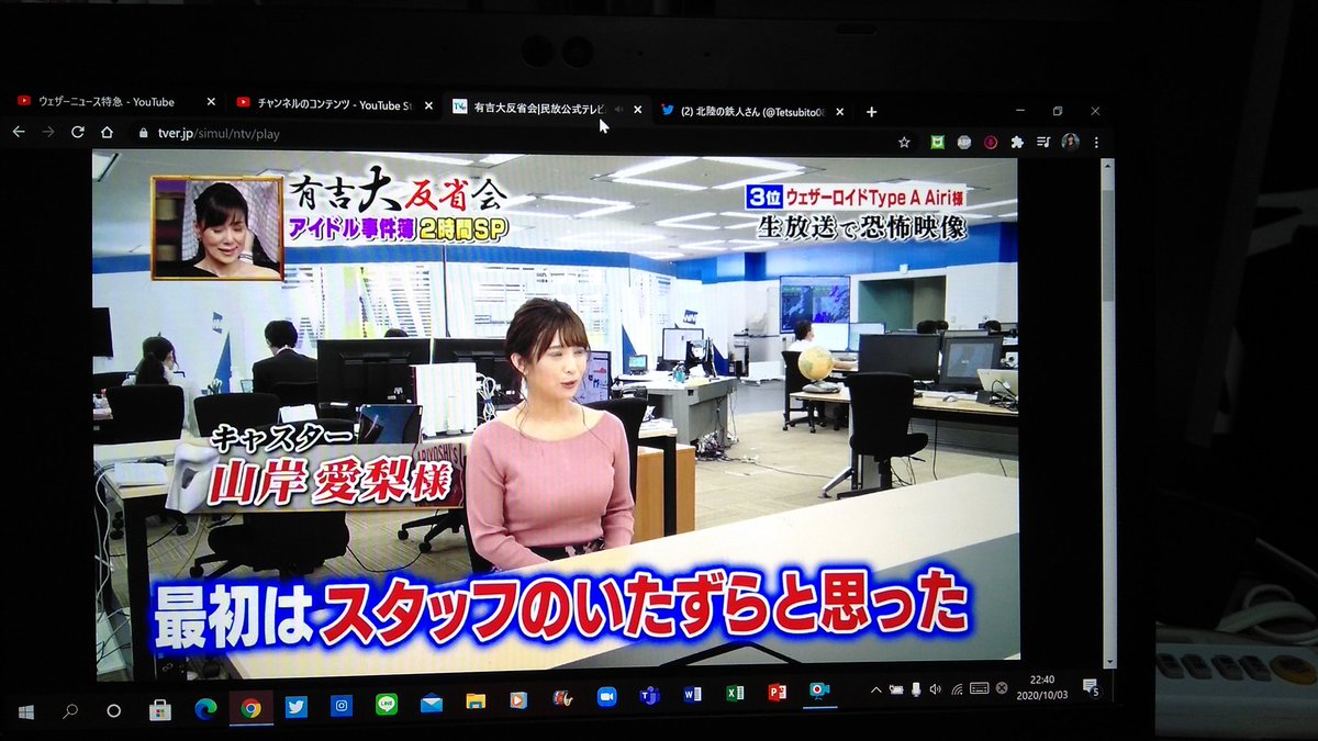 日本テレビ系列の「有吉大反省会」という番組で山岸愛梨(あいりん)キャスターとウェザーロイドTypeA Airi(ポン子)が出演していました!