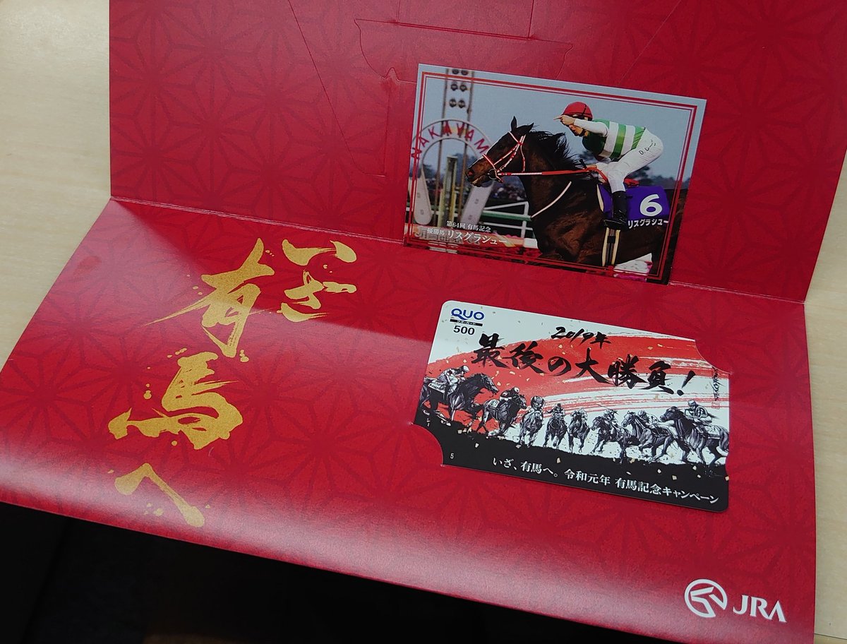 有馬記念は当たらなかったけど、有馬記念のキャンペーンに当たった。 JRAありがとう。クオカードの何倍ものお金が無くなったけど、これがあるだけで少しだけ心が救われました。