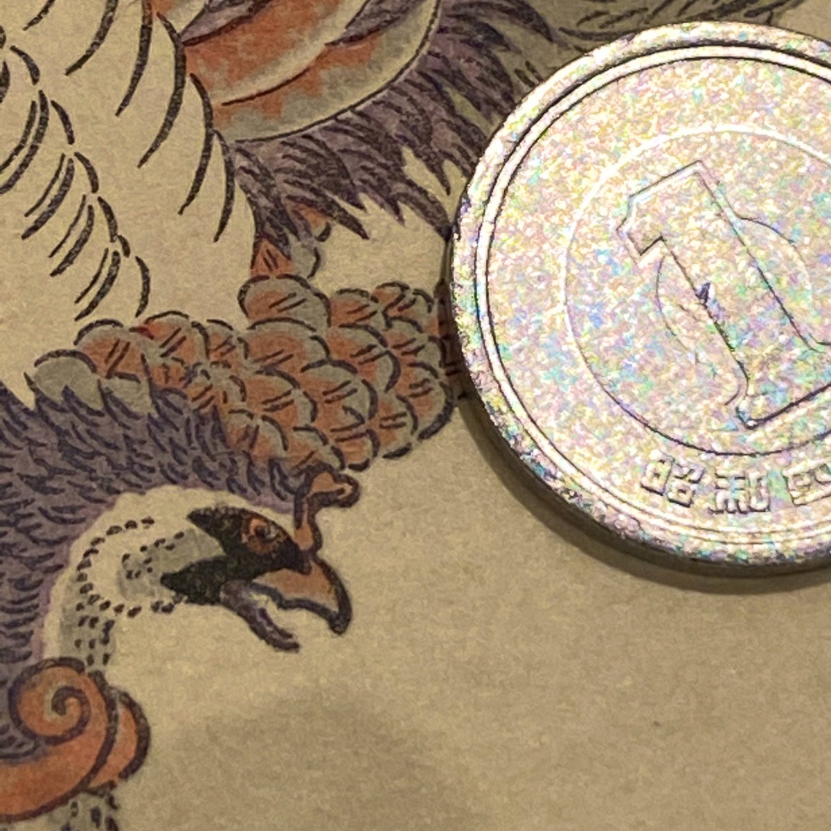 そして購入した「伊藤若冲:鳳凰図」 すっごい...これ葉書サイズなんですよ...葉書サイズの鳳凰図。 1円玉並べたけどすっごい... これが一番目が気に入ったので。 多分3版(摺数は今度聞く)だと思うんだけど、やばい。