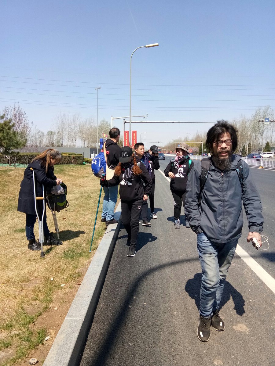 #李文足千里寻夫 徒步第五天 王俏嶺:上午11点10分,经历了昨天6.9公里的廊坊和平路上徒步的一天,今天的徒步任务就显得重了。今天走入104国道,15公里。不知道鼻子被擤成红鼻头的李文足能否坚持下来?别拿砖拍我.....如果走不了这么远,我们只能露宿荒郊了。我跟文足的推特和脸书,一上午发不出消息。 pic.twitter.com/1wLtSyTwmM