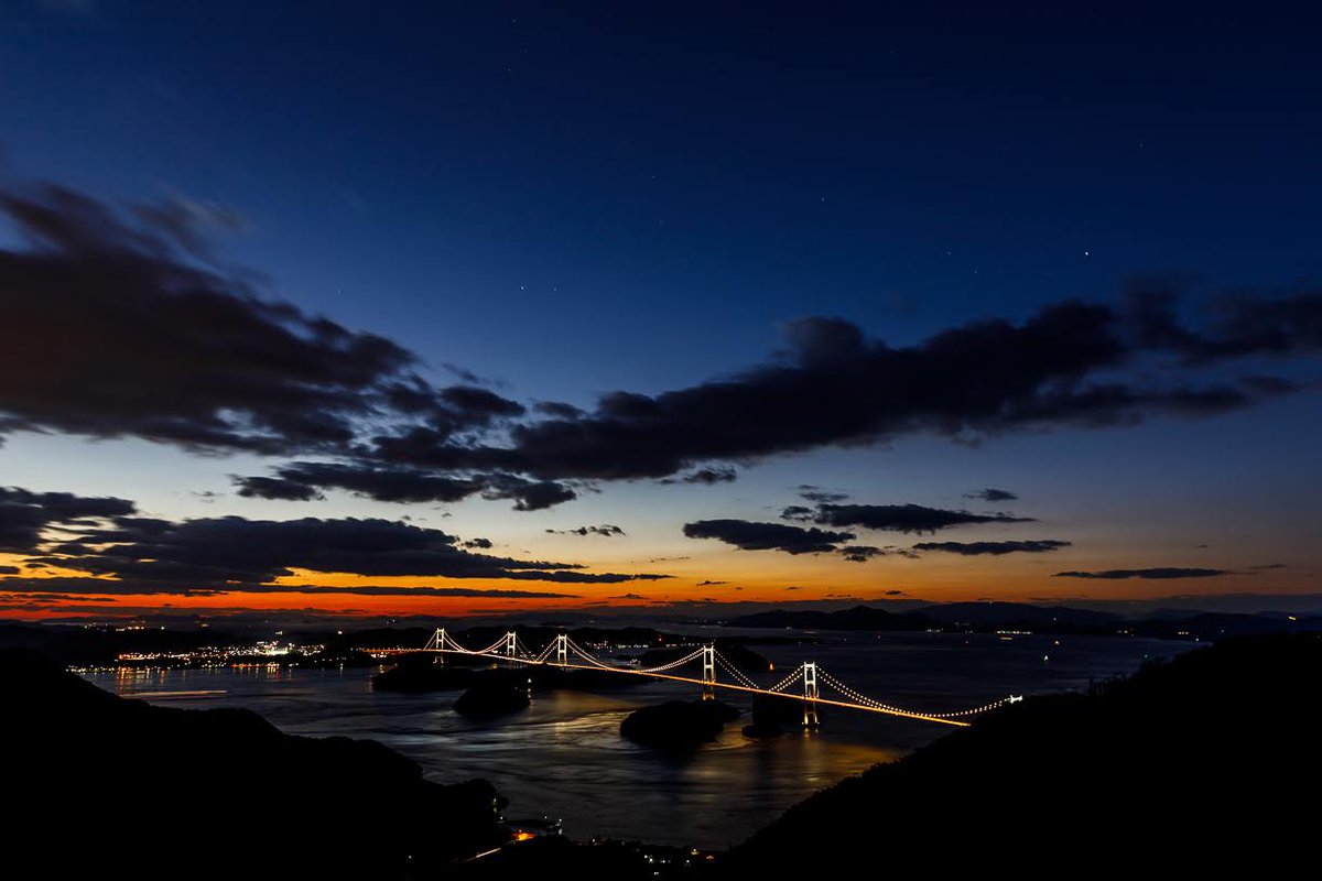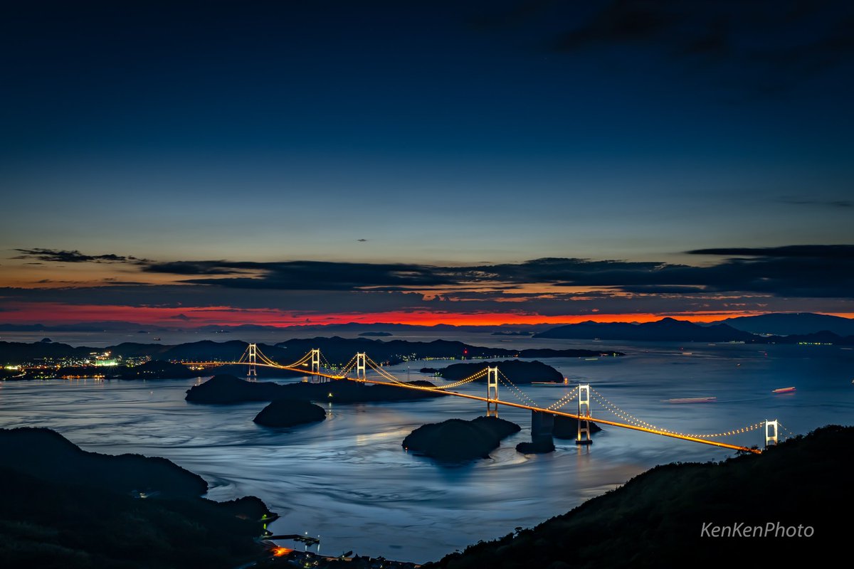 瀬戸内の島々としまなみ海道の夕暮れ。 2日連続通ってようやくキレイな夕景と橋のライトアップを撮れました! ここ景色もめっちゃいいし風も気持ちいいし最高です。 瀬戸内海最大の難所と言われる速い潮の流れがすごい。。