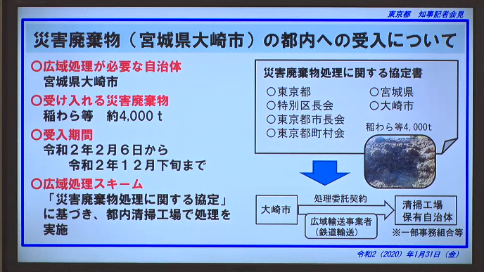 昨年10月の台風19号で発生した宮城県大崎市の災害廃棄物(約4000t)を受け入れ、都内の清掃工場で処理を実施する。