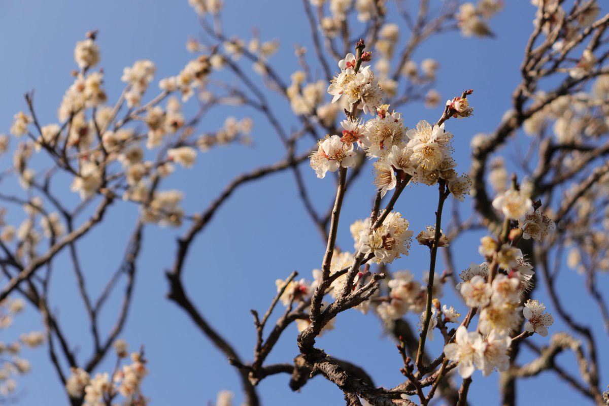 お昼はスッキリ青空! 梅の花もだいぶ咲いてきた ʕᵔᴥᵔʔ メジロもいたけど撮影は難しいね >.<