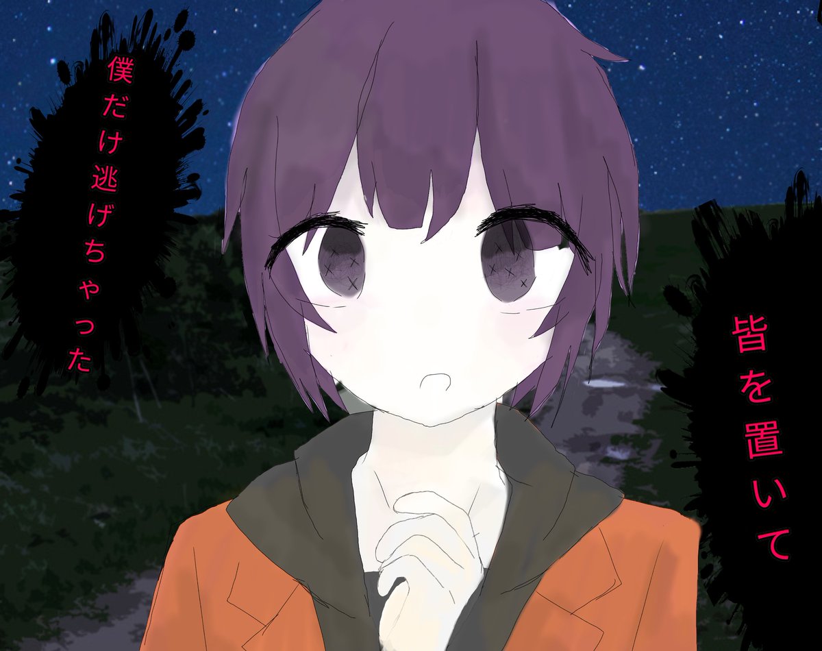 脱獄した後の死神くんです。。。1人だけ逃げてきたことに罪悪感を感じるんじゃないかと思い暗めにしましたがどうですかね。。服が刑務所の時のままなのはご了承ください。。←←← 続き楽しみにして生きます。。。