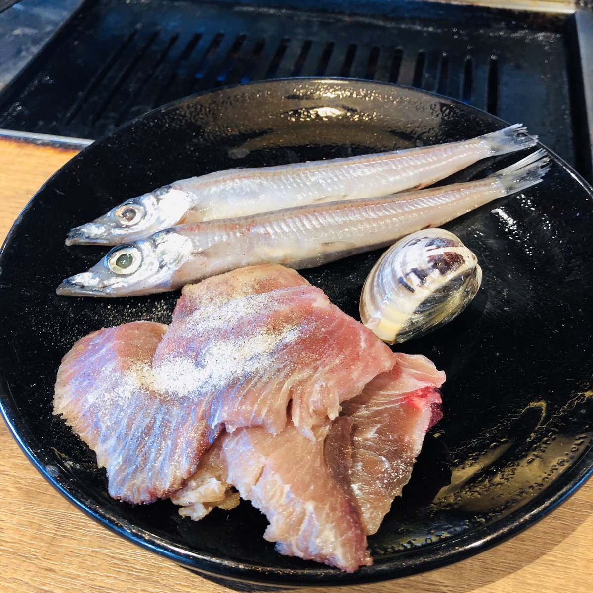 平日の昼間から沼津港でハマグリとメギスとマグロの頰肉を浜焼きの刑に処してます。