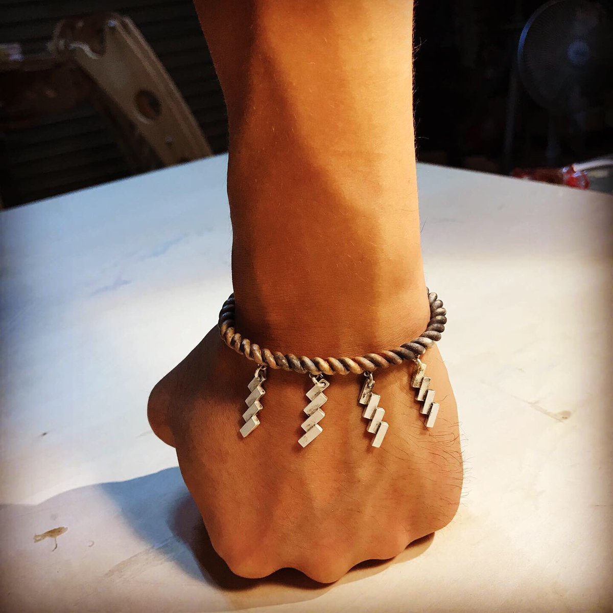 紙垂をつなげるカンが壊れたので修理した。 久しぶりで失敗してるうちに、焼き色が付いてしまった。 でもこの方が注連縄の色に近いなと思って紙垂だけ漂白した。 腕に神が宿る注連縄バングル。