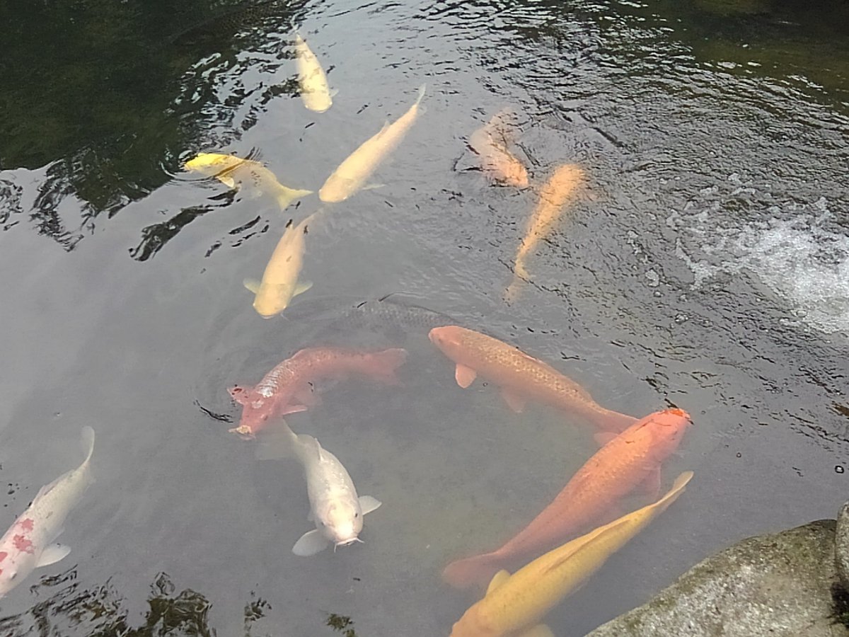 水面と鯉たちの揺らぎが、まさに宝石のように輝いてます。