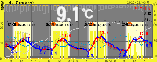 【22:00時点 9.1℃ 51%】 12.9~2.6℃ (南部)★注意報:強風 =静岡県浜松市