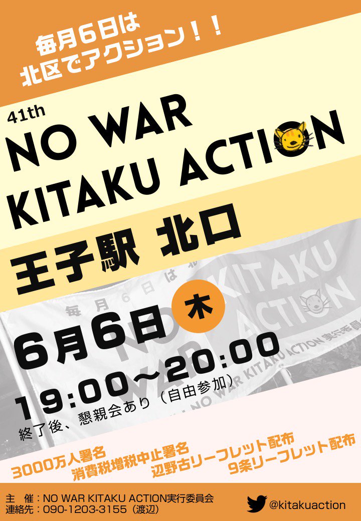 【安倍政治ノー 行動予定】東京・北区でNO WAR北区アクシ ョン上がります。 ◆6月6日(木)19時~20時 ◆王子駅北口