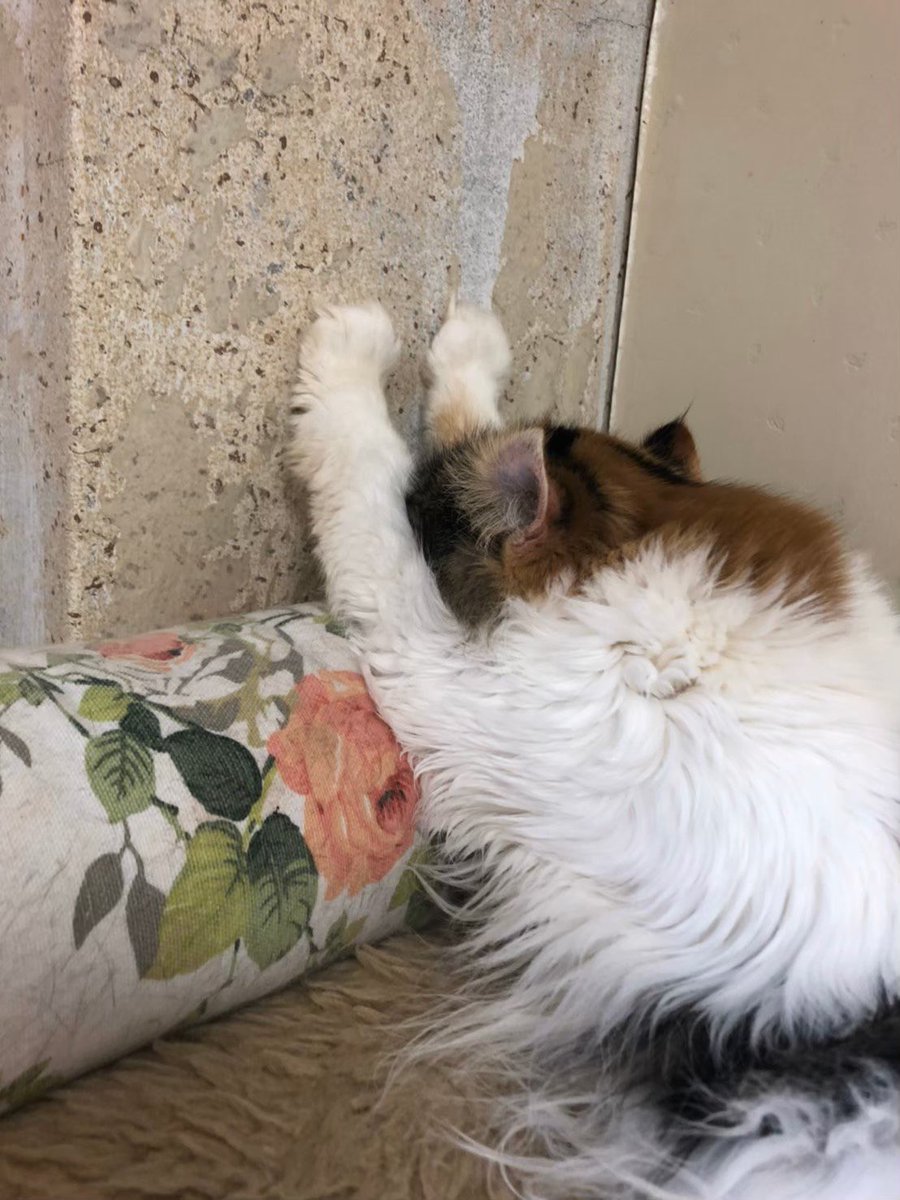 壁にぺたっと肉球つけて寝るカロンちゃん