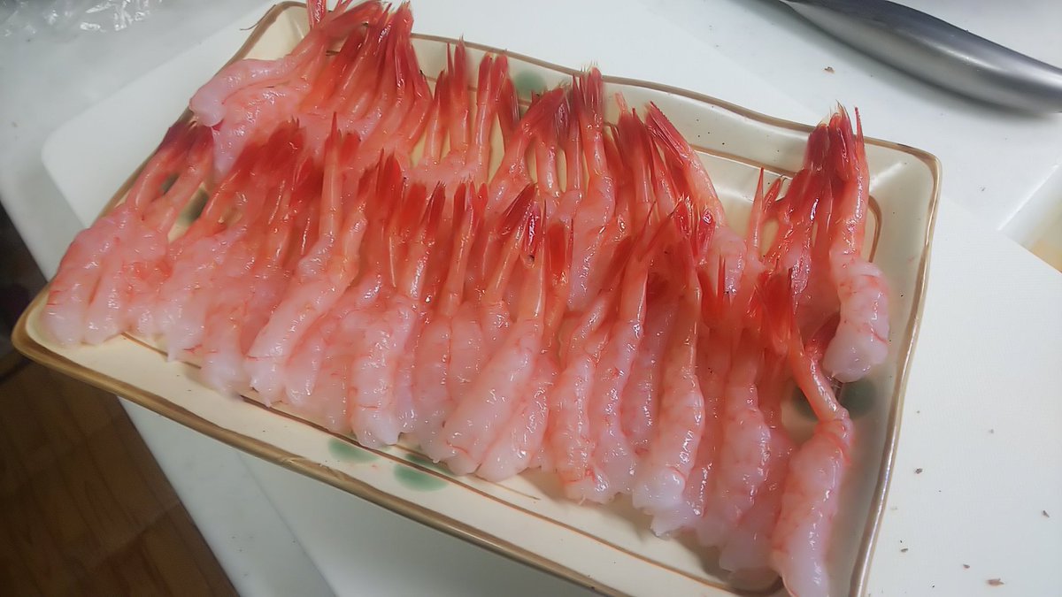 佐渡産甘エビ(ナンバンエビ)が…100円!(おつとめ品だが…)ラッキー!2パック購入して剥いてみた!旨そうだぜ!