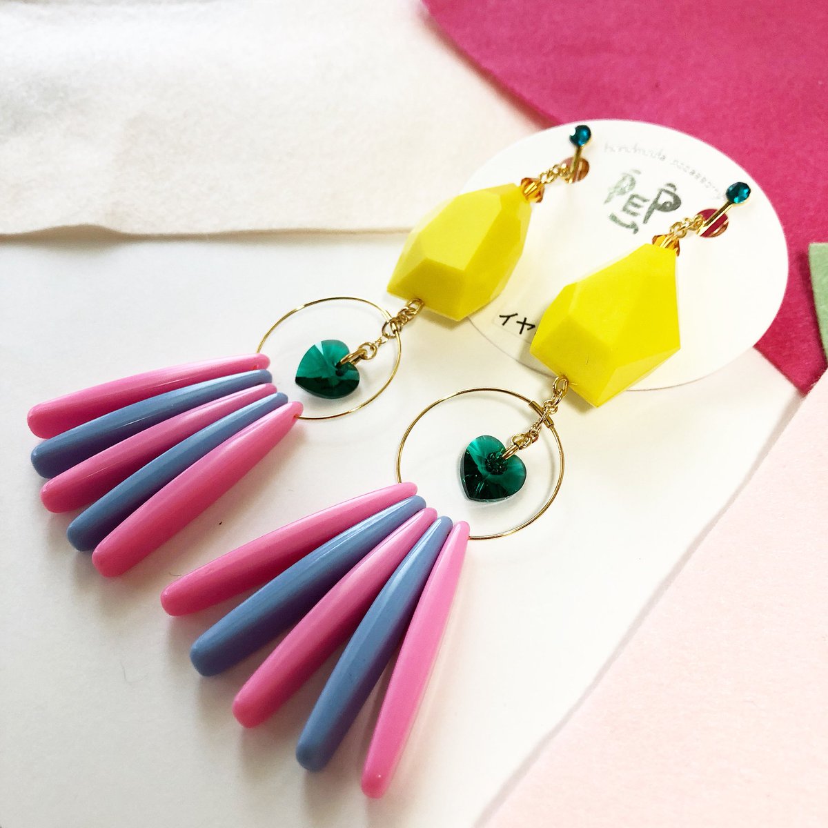 #無地 でこんなにやかましくなるとは思いませんでしたねー笑笑#緑 は#ハート の#スワロフスキー でございます。大きめ^ ^#PEP#ペップ#ハンドメイド#ハンドメイドアクセサリー#一点もの#再販無し#ピアス#イヤリング#長いから可愛いのよpic.twitter.com/cLbyTzZOpf