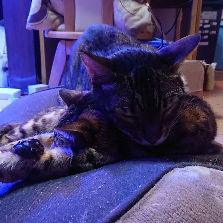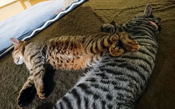エピソード:最近飼い初めた猫が、先住猫の上に足を上げて寝ている姿が