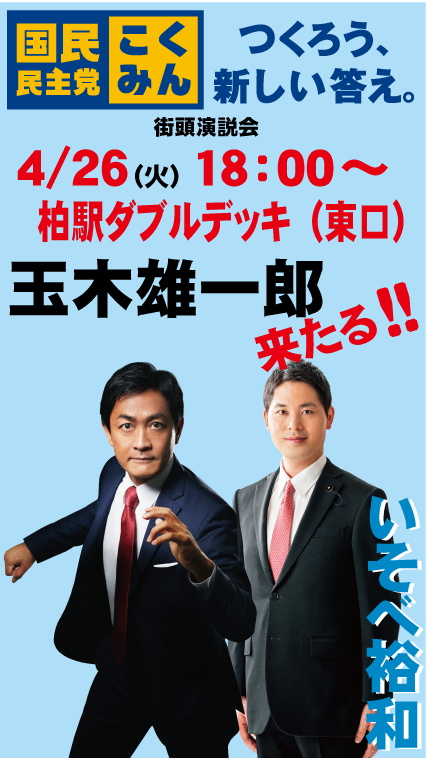 #国民民主党 の#玉木雄一郎 代表が柏駅ダブルデッキ(東口)に来ます! ぜひ玉木代表をひと目、見に来てください! pic.twitter.com/kiL5DzP23q