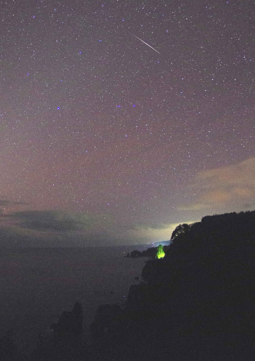 おはようございます。久しぶりのツイートは今朝の北山崎です。月と漁船の明かりと上空にはアマツバメ。いつ来ても凛とさせられるそんな場所です。